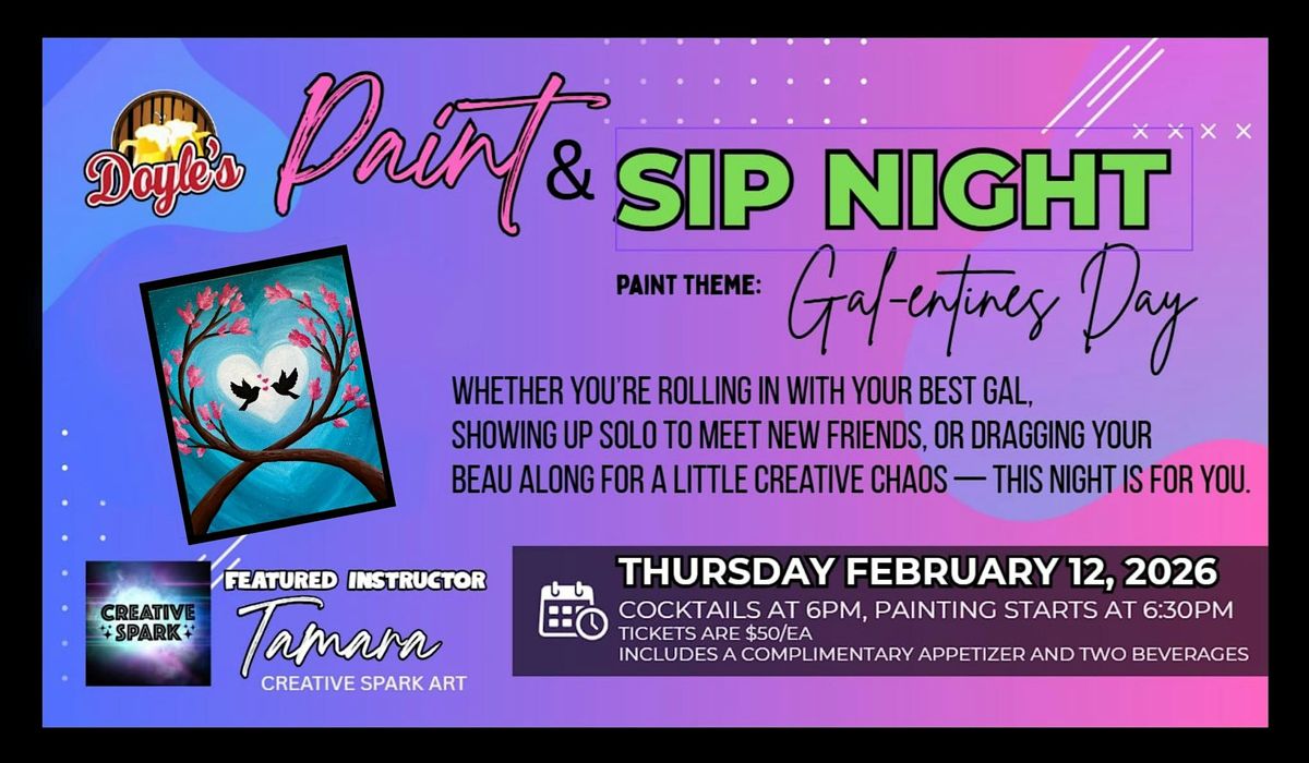 Grab your besties, your boo, or just your fabulous self and join us for a night of creativity, cocktails, and good vibes! This Galentine’s Day Paint Party is all about fun, friendship, and a little splash of romance—perfect whether you’re rolling in with your best gal, showing up solo to meet new friends, or bringing your beau along for a creative date night. Join us in creating “Lovely Twilight,” a whimsical painting with a teal heart-shaped backdrop, two lovebirds in flight, and blooming cherry blossom branches. (Can be a partner painting if desired)