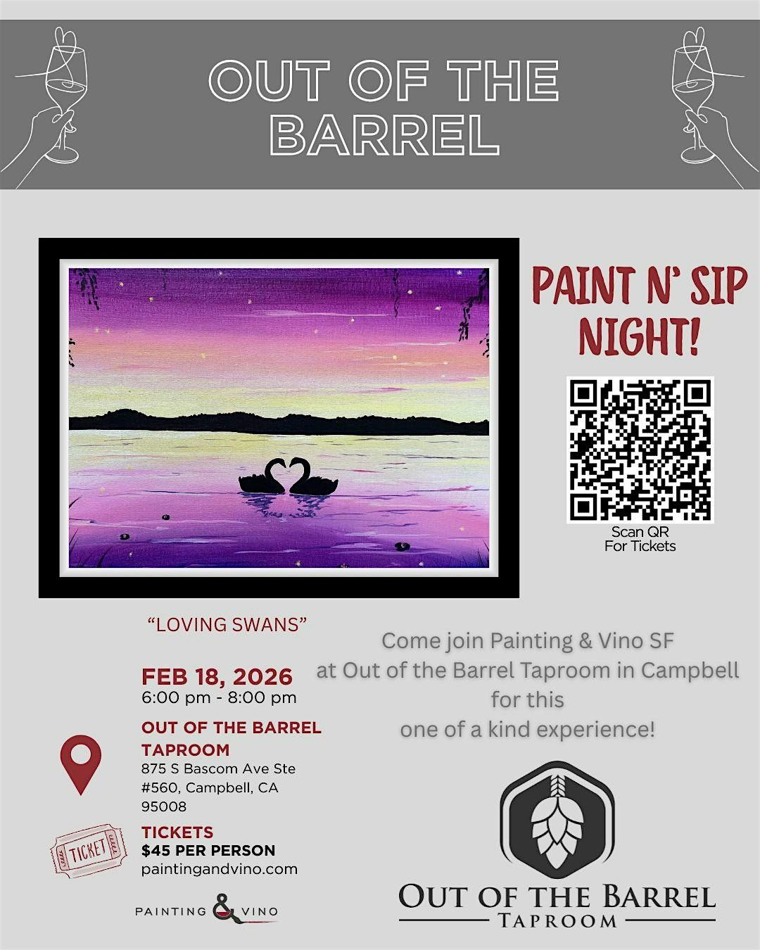 Join us for a fun in-person evening where you'll get to paint a beautiful swan while sipping your favorite drinks. No experience needed—just bring your creativity and good vibes! It's the perfect way to relax, socialize, and unleash your inner artist. Don’t miss out on this chill and artsy night at Out of the Barrel in Campbell!
