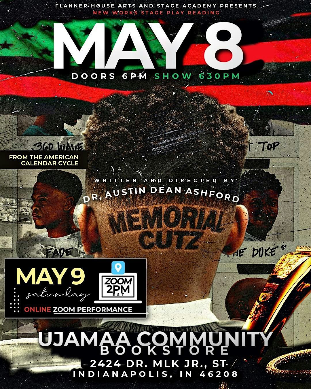Join us for a developmental staged reading of MEMORIAL CUTZ, a brand-new Afrofuturistic May play written and directed by Dr. Austin Dean Ashford as part of The American Calendar Cycle.