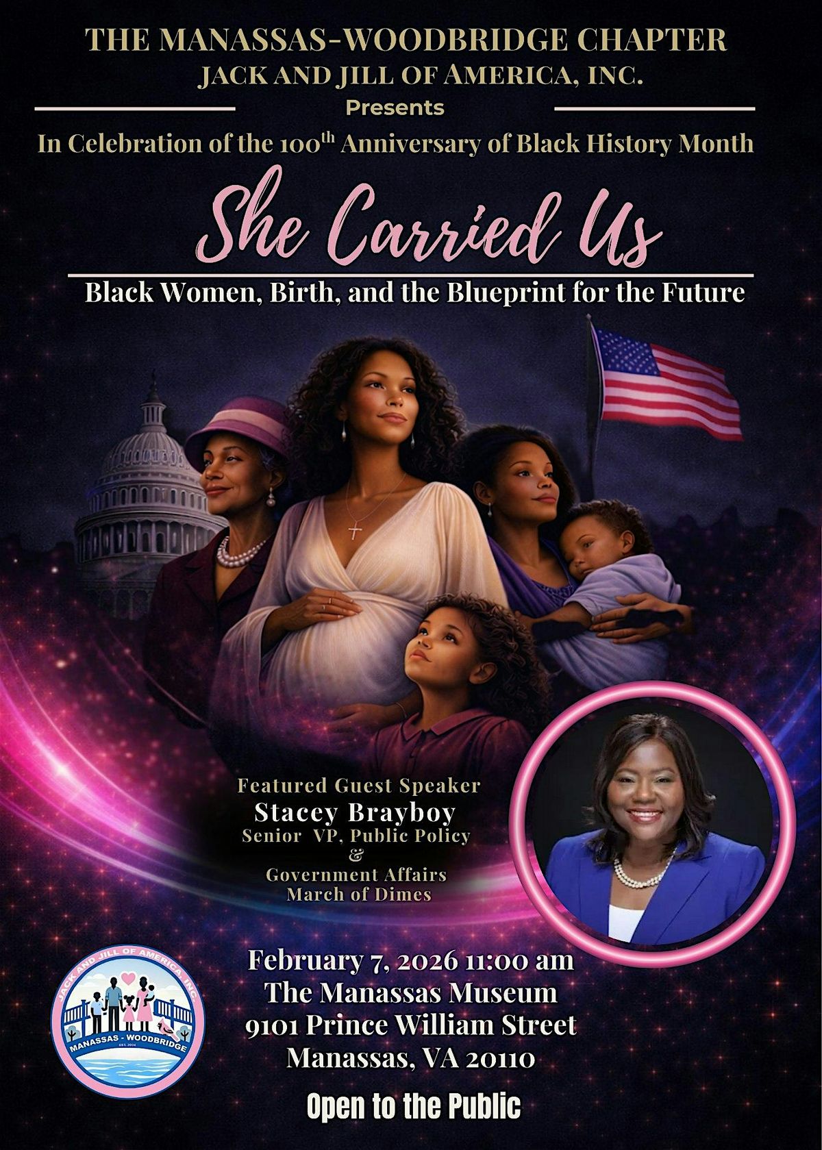 Welcome to "She Carried Us" event at The Manassas Museum on February 7, 2026 at 11:00 AM (Eastern Time)! Join the Manassas Woodbridge Chapter, Jack and Jill of America, Incorporated for an empowering discussion on Black Women, Birth, and the Blueprint for the Future. Let's celebrate the strength and resilience of Black women in shaping our future. This event promises to be insightful and inspiring. Don't miss out on this opportunity to be part of an important conversation. See you there!