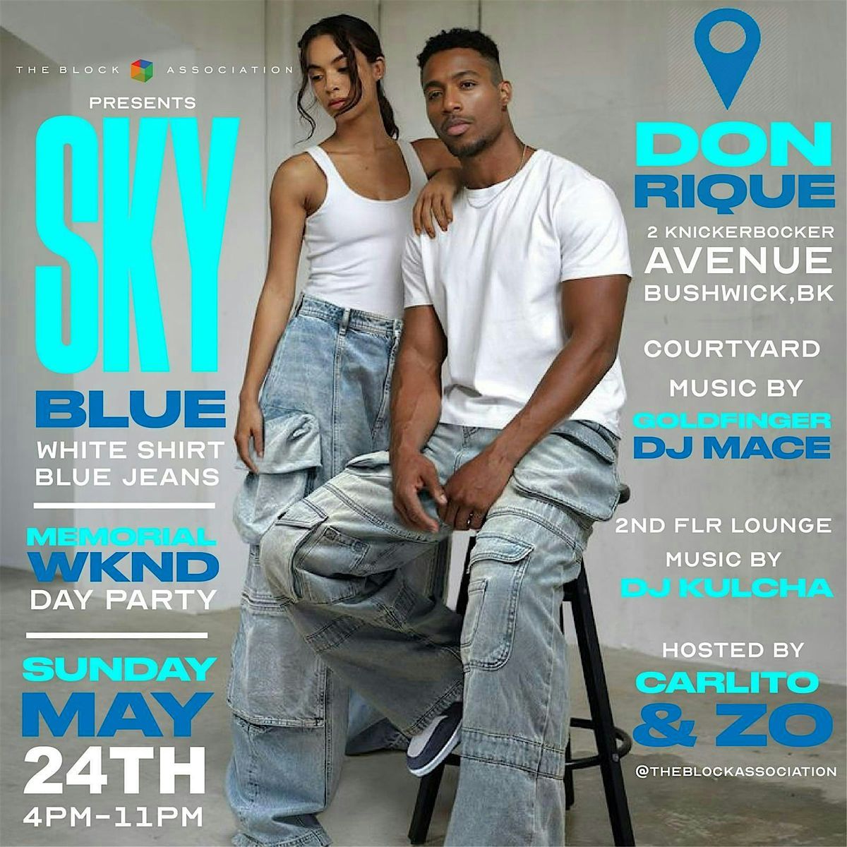 Ladies and gentlemen, The Block Association proudly presents “SKY BLUE". This is the first time EVER that the original WHITE SHIRT BLUE JEANS will be produced on a Memorial holiday weekend in BROOKLYN! This epic event will take place on Sunday, May 24, 2026 at the exclusive @ Don Rique ( 2 Knickbocker Avenue Bushwick Brooklyn ) from 4pm - 11pm. Music by Brooklyn finest DJ Goldfinger , DJ Mace and DJ Kulcha. Early arrival is highly suggested.