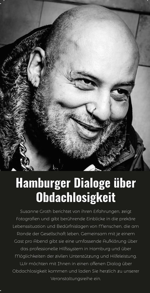 Im Winter diesen Jahres starten wir wieder mit unseren Hamburger Dialogen zum Themaobdachlosigkeit.Die Veranstaltungsreihe beinhaltet weitere Termine, die jeweils an einem Freitag in den Monaten Februar 2023 bis April 2023 durchgeführt werden. Mit je einem Gast aus professionellen Einrichtungen der Obdachlosenhilfe werden brisante Themen wie "Obdachlose Frauen – unauffällig und besonders gefährdet“ „Gut Leben ist anders- Drogen, Sexarbeit und Obdachlosigkeit“ und „Obdachlosigkeit und Migrationshintergrund“ erörtert.