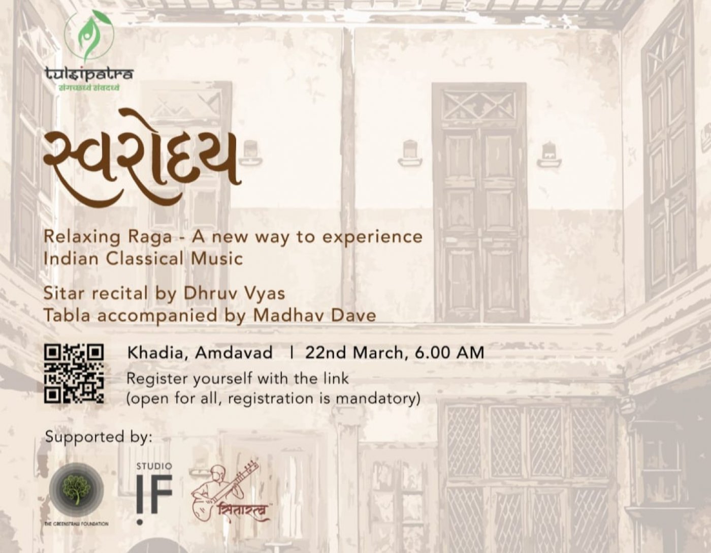 Tulsipatra Art Foundation is a cultural organization established in 2014 and officially registered in 2019, committed to promoting theatre, literature, and traditional performing arts as powerful mediums of cultural expression and social dialogue. Guided by the motto “संगच्छध्वंसंवदध्वं”, the foundation works to encourage collective harmony, meaningful dialogue, and a sense of righteousness in society through artistic engagement. One of it's initiatives Swarodaya is about experiencing energy of morning with music. To experience soulful performance of Dhruv Vyas on Sitar with Madhav Dave on Tabla please register yourself.