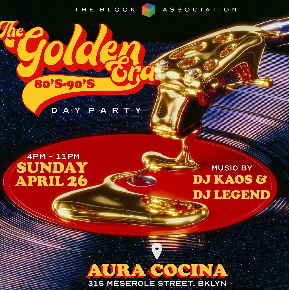 IT'S ON AGAIN BROOKLYN! We are bringing everyone back to the DANCE FLOOR with nothing but great music and vibes!. This time around we are presenting "The Golden Era" edition VOL #3 with TWO Dynamic DJS. We have DJ KAOS & DJ LEGEND that will be guiding you through the two decades of classics at the exclusive AURA COCINA. On Sunday April 26th from 4pm-11pm. We are bringing back this event highlighting the very best hits from the two GREATEST decades of music…the 80’s & the 90’s respectfully. We are inviting you to experience it all with us for the BIG NIGHT!