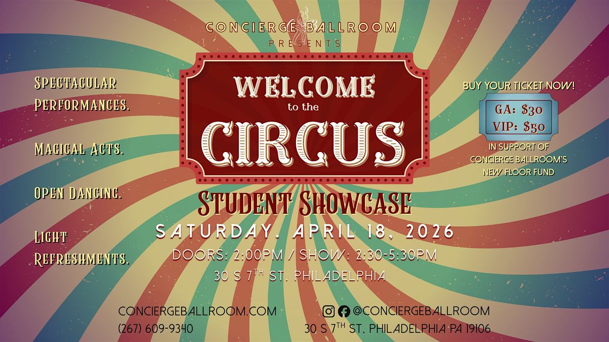 Welcome to the Circus! Concierge Ballroomโs Annual Dance Showcase is happening on Saturday, April 18, 2026, doors open at 2PM. Prepare to be amazed by a series of marvelous dance performances from our talented students and professionals. Proceeds from this event will also be contributing to Concierge Ballroomโs New Floor Fund, so come support and tell your friends!