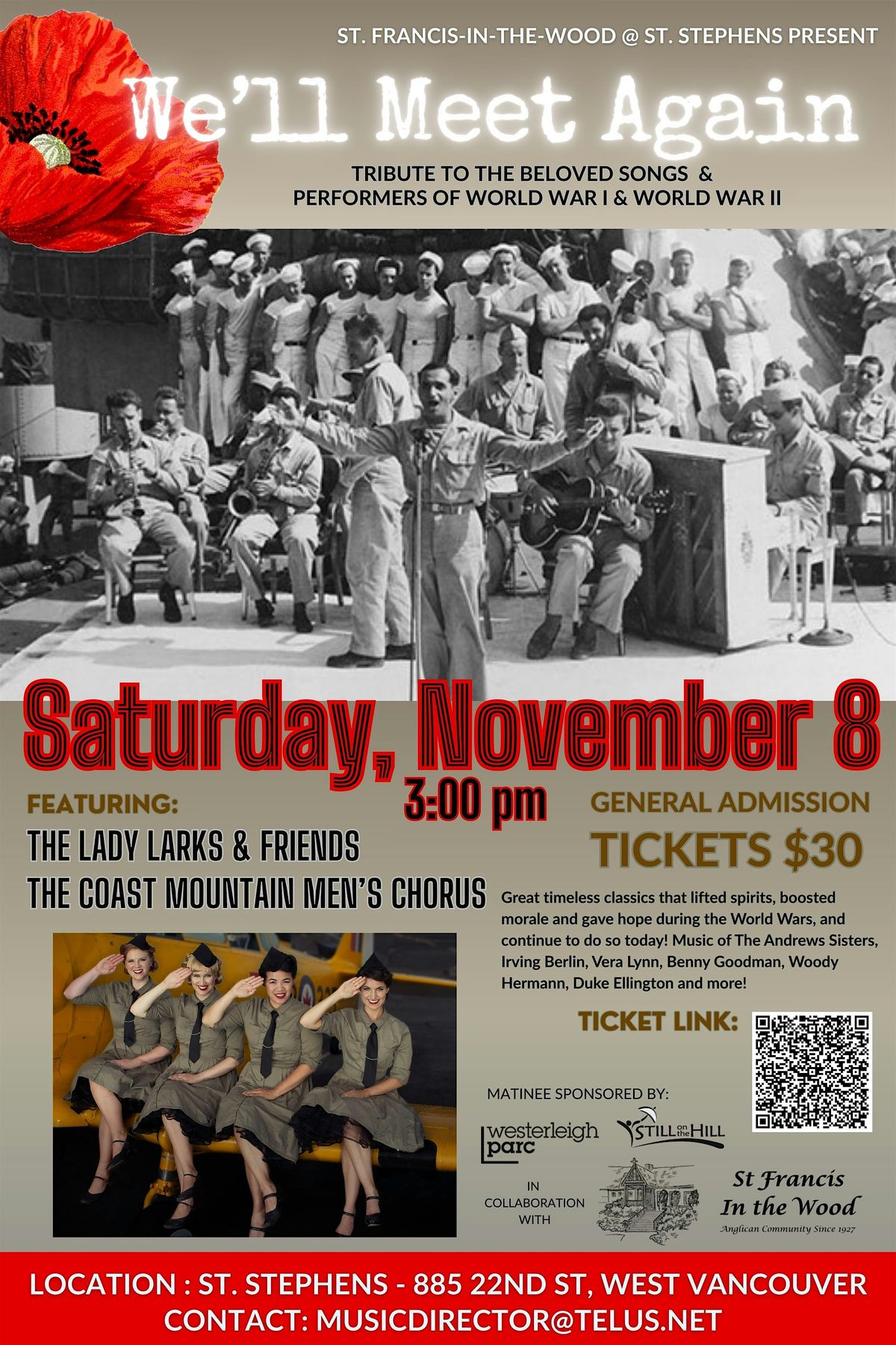 Please join us and sing along to the great timeless classics that lifted spirits, boosted morale and gave hope during the World Wars, and continue to do so today. Featuring favorite songs and works of Dame Vera Lynn, Benny Goodman, Irving Berlin, Woody Hermann and The Andrews Sisters, Duke Ellington and more!