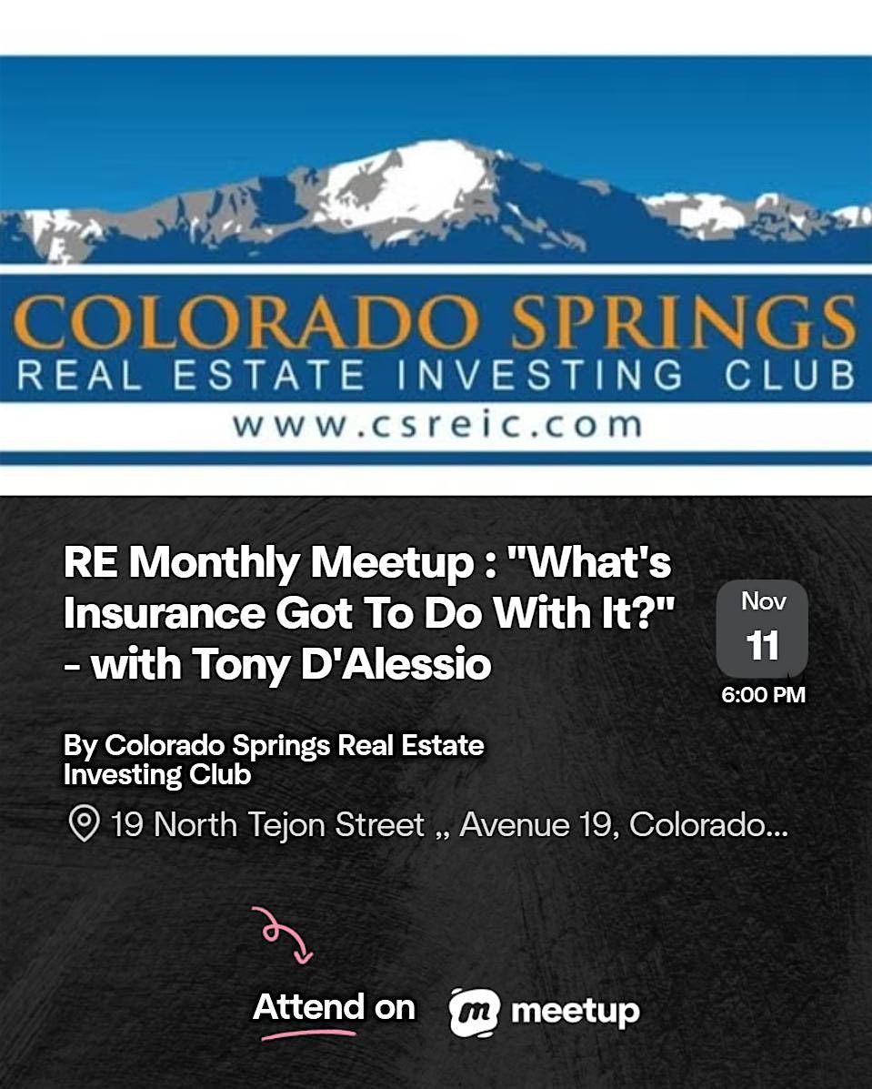 So grab a friend, bring some business cards (digital or old school), have a (soft)drink and meet some other like-minded investors in Colorado Springs while we learn from a local RE professional! See you there! :)