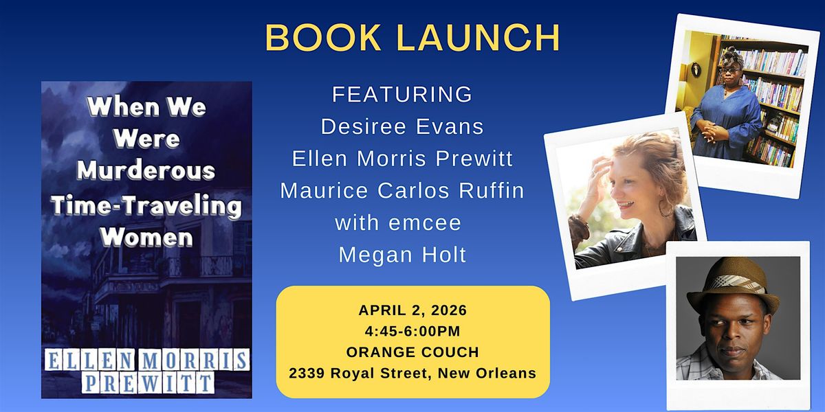 On April 2 at 4:45pm at the Orange Couch, Ellen Morris Prewitt will celebrate the launch of her new novel, When We Were Murderous Time-Traveling Women! Fellow New Orleans writers Desiree Evans and Maurice Carlos Ruffin will join her for a reading emceed by Megan Holt.