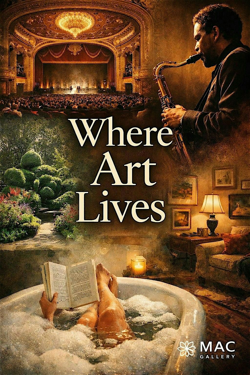 Where Art Lives explores the spaces where art is performed, cultivated, collected, and quietly absorbed. All of this work is from my artful life and how & where I absorb fine art. From the grandeur of the Detroit Opera House to the intimacy of a jazz musician mid-improvisation, from gardens shaped by artists’ hands to homes filled with paintings, the work reflects on how art inhabits both monumental and everyday environments. Even the bathtub becomes a site of reflection — a private interior where creativity and contemplation quietly unfold.