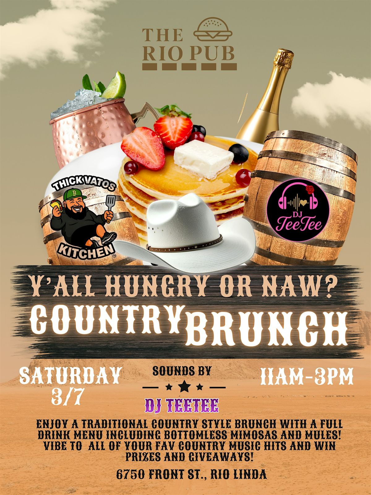 Saddle up for a one-of-a-kind Country Music Brunch Experience at Rio Pub on Saturday, March 7 from 11 AM to 3 PM, hosted by Thick Vatos Kitchen and sounds by DJ TeeTee.