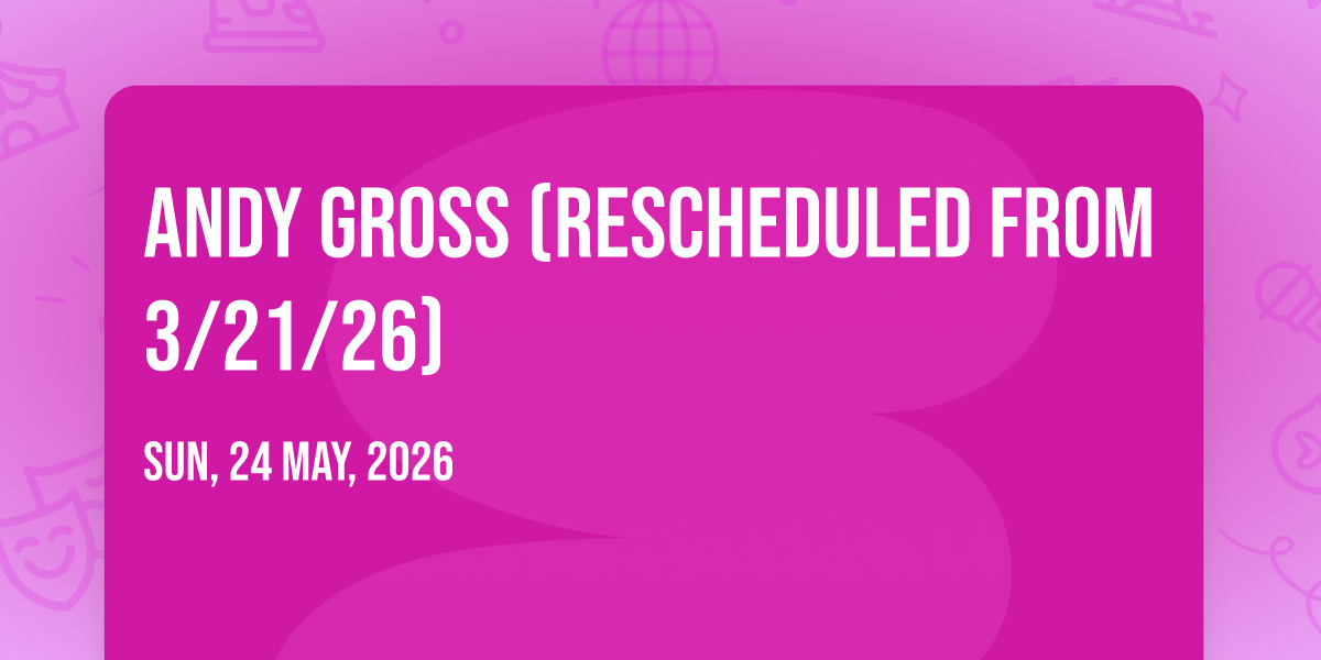 π Location: 41.3228, -74.8002π Welcome to Andy Gross (Rescheduled from 3/21/26), where the impossible becomes possible and dreams take flight! ποΈ Join us at Milford Theater in the heart of Milford, PA for an event that will redefine your expectations. π On May 24th, 2026 at 12:00 AM, witness the transformation of space and time into something truly magical. β¨ It's a curated experience combining the best of innovation, entertainment, and community spirit, creating moments that will be remembered for years to come. Whether you're a first-time visitor or a seasoned enthusiast, prepare to be amazed. π Book now to ensure your place in this unforgettable experience!