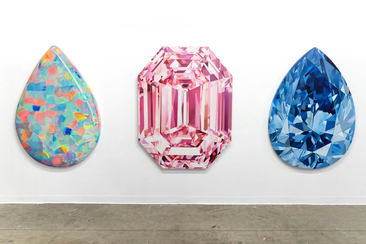 Angie Crabtree’s paintings dissect the mythology of luxury. Diamonds became her first muse—the commodification of nature, the way raw beauty is captured, fixed, and displayed as proof of success. Their natural forms, once buried deep beneath the earth, are now mined, cut, and polished into representations of what’s impossibly valuable. By enlarging them to a monumental scale, she invites viewers to consider the origins of the stones, their societal significance, and to reconsider their true value.