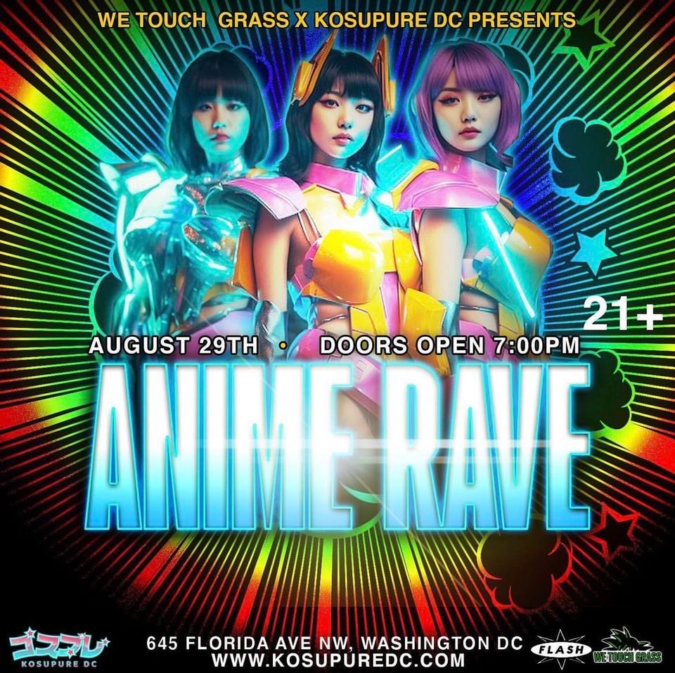 The iconic Anime Rave comes to Washington DC! Join us for #WeTouchGrass, Kosupure DC, and Alex Kade on August 29, 2023. This 21+ event will feature acclaimed local cosplayers, delicious anime-inspired food and drink vendors, a cosplay contest, and anime giveaways from our generous sponsors.Experience #WeTouchGrass and Alex Kade's electrifying Anime Raves, as seen at Otafest, Anime Expo, Otakuthon, and UwU Con, and dance the night away to your favorite anime tunes.