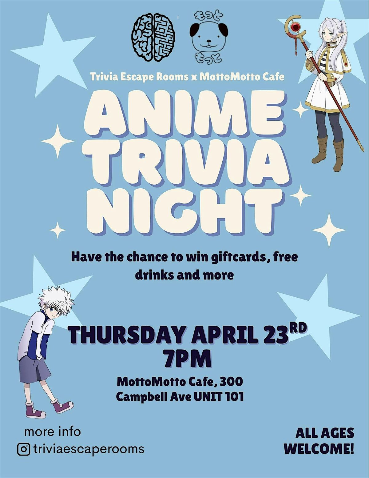 MottoMotto Cafe is hosting its first trivia night with Trivia Escape Rooms for a whimsy-filled evening featuring questions from the Modern Anime Era, where the story is faster paced and animation is done using digital cells.
