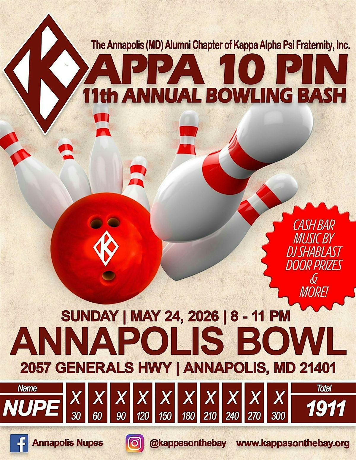 Please join the Brothers of the Annapolis (MD) Alumni Chapter of Kappa Alpha Psi for our 11th Annual Bowling Bash Sunday, May 24, 2026.
