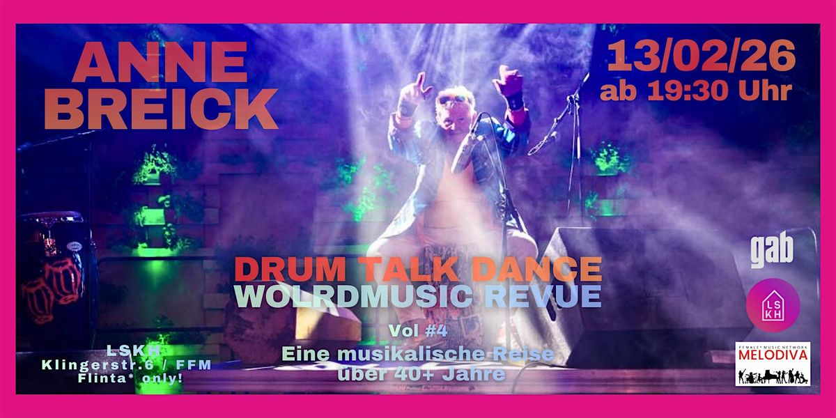 Alle Songs werden live begleitet und percussiv verziert. Geschichten zu den Songs, den besonderen Trommeln und ihrer Herkunft runden den Abend ab. Mitmachparts und eine finale Session mit dem Publikum sind gewollt und gewünscht! Da bleibt kein “Beat trocken, da wippt jede Wimper mit..." Mit der Wiederaufnahme der Revue erfüllt sich Anne Breick und ihre DJane Andilicious, die den Abend