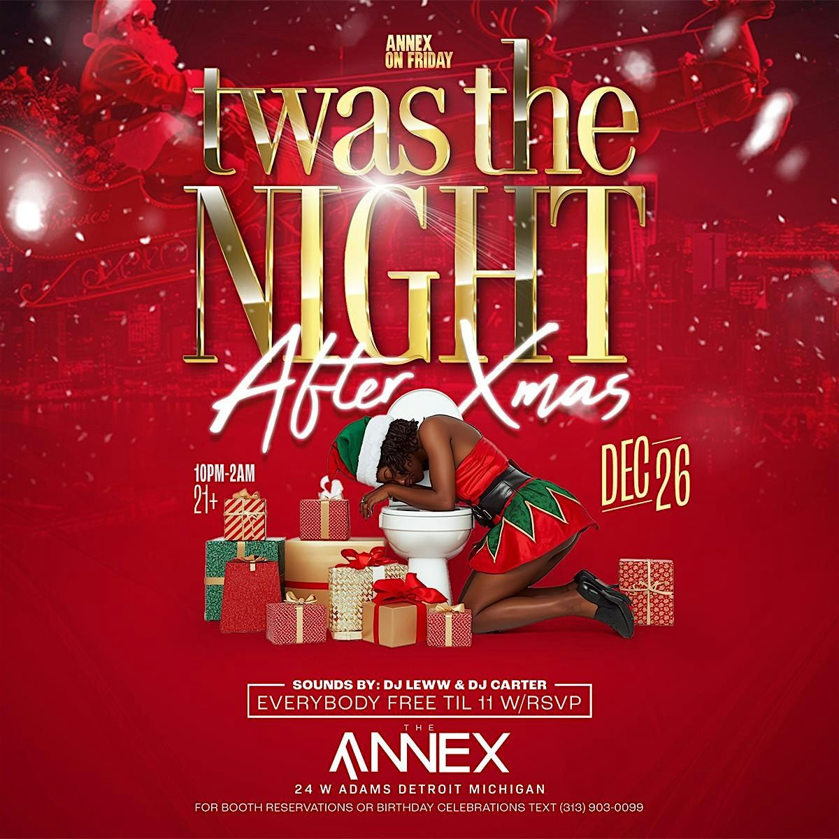 Join us at Annex on Friday for Twas The Night After Xmas! The #1 nightlife party in Detroit. Free entry and complimentary drinks before 11pm with RSVP. Annex Fridays is your destination for the most fun nightlife experience.