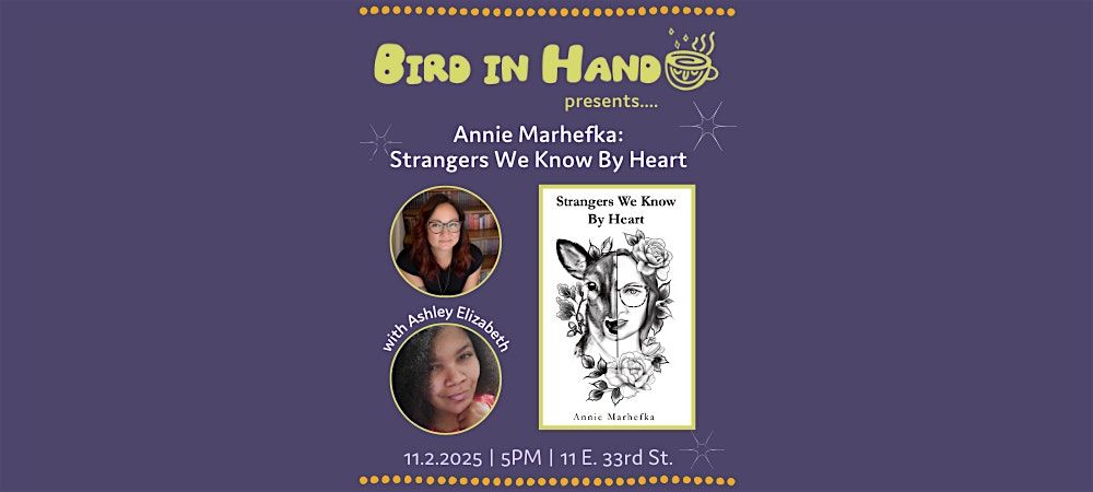 Bird in Hand is celebrating the release of Annie Marhefka's chapbook, Strangers We Know By Heart, published by Garden Party Collective in September! Annie is an incredible engine of community around writing in Baltimore via her work as the Executive Director of Yellow Arrow Publishing, and many other initiatives, so it is especially fitting that this collection is a series of love letters to strangers.