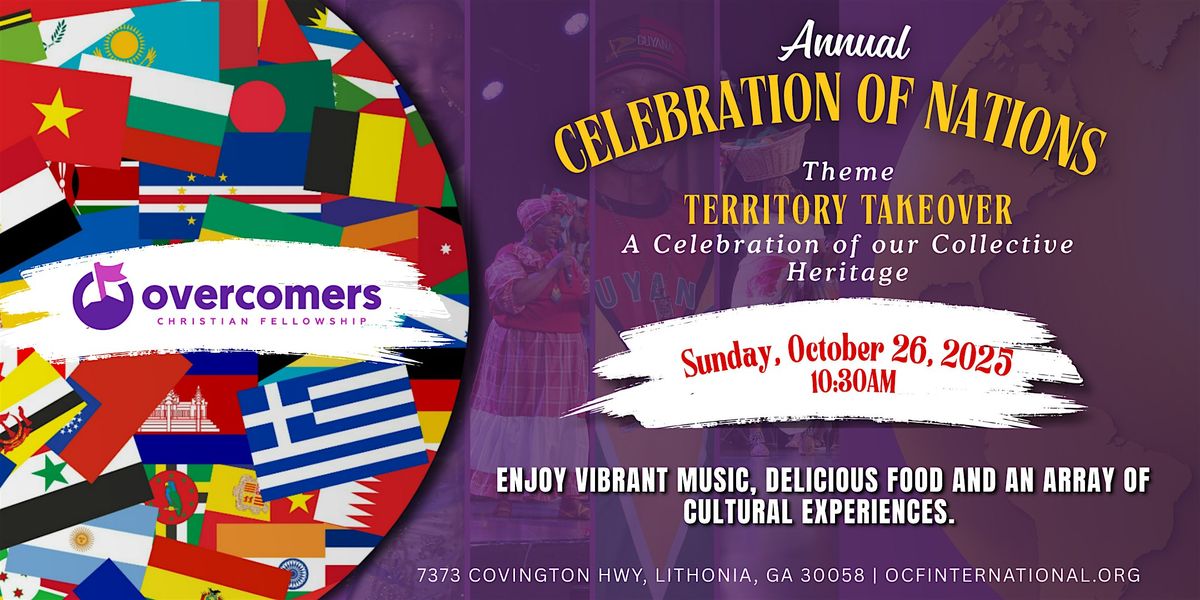 🌍✨ Join us for an unforgettable day at Overcomers Christian Fellowship's annual Celebration of Nations! 🎉 This year’s theme is “Territory Takeover : A Celebration of our Collective Heritage.” On Sunday, October 26, 2025, come celebrate diversity and unity in Christ by representing your country with flags, traditional clothing, and more!🎶🍲 Enjoy vibrant music, delicious food, and an array of cultural experiences. Don’t miss out on this amazing event!
