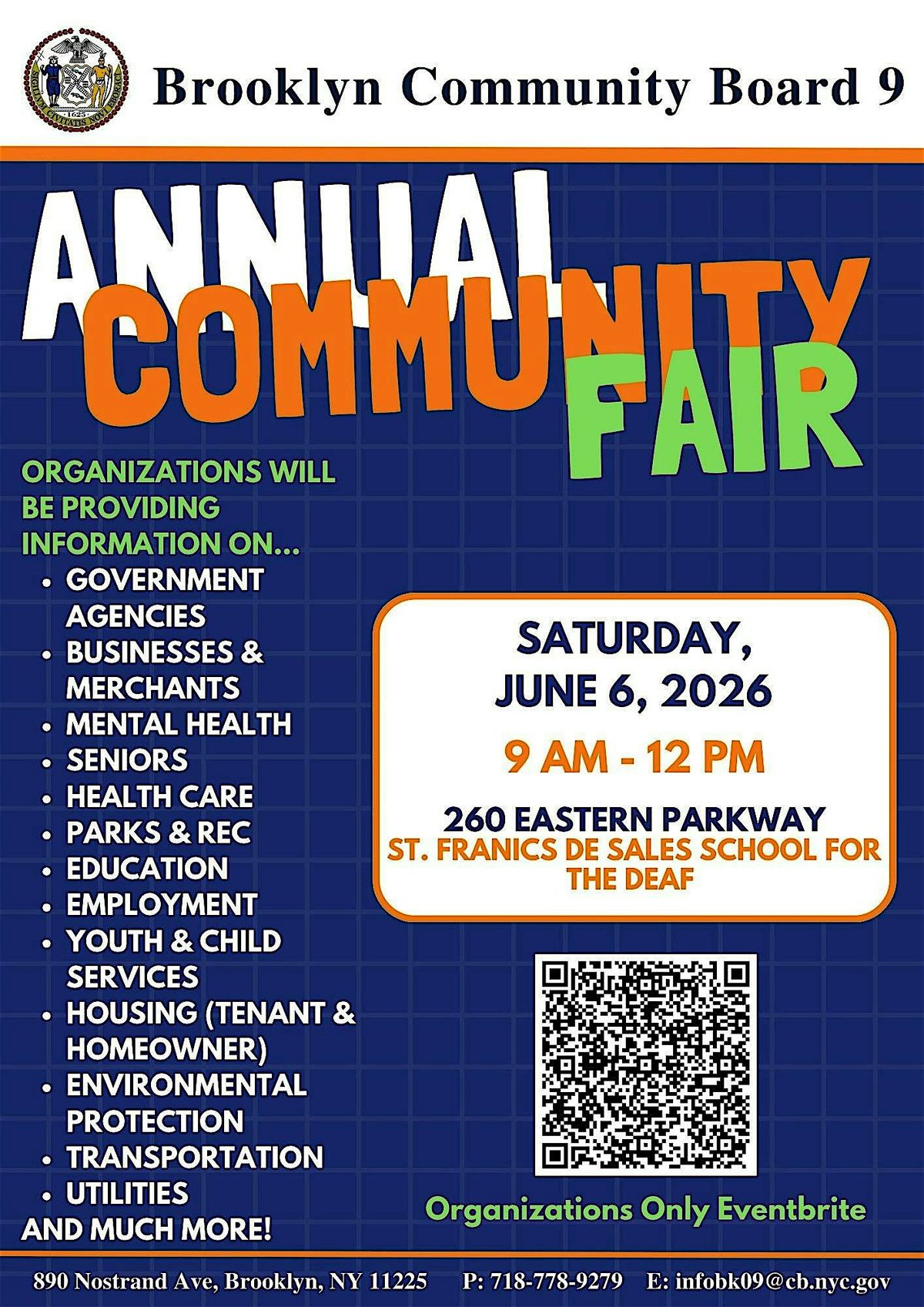 Brooklyn Community Board 9 invites local organizations, agencies, and businesses to participate in our Annual Community Fair on Saturday, June 6, 2026, from 9:00 AM - 12:00 PM at 260 Eastern Parkway – St. Francis de Sales School for the Deaf.