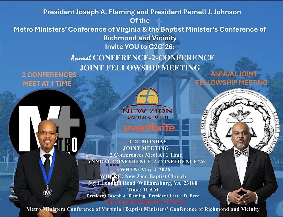 This annual gathering is for the active members of both The Metro Ministers' Conference of Virginia and the Baptist Minister's Conference of Richmond & Vicinity. A Joint Fellowship Meeting and Meal are shared between the two Conferences.