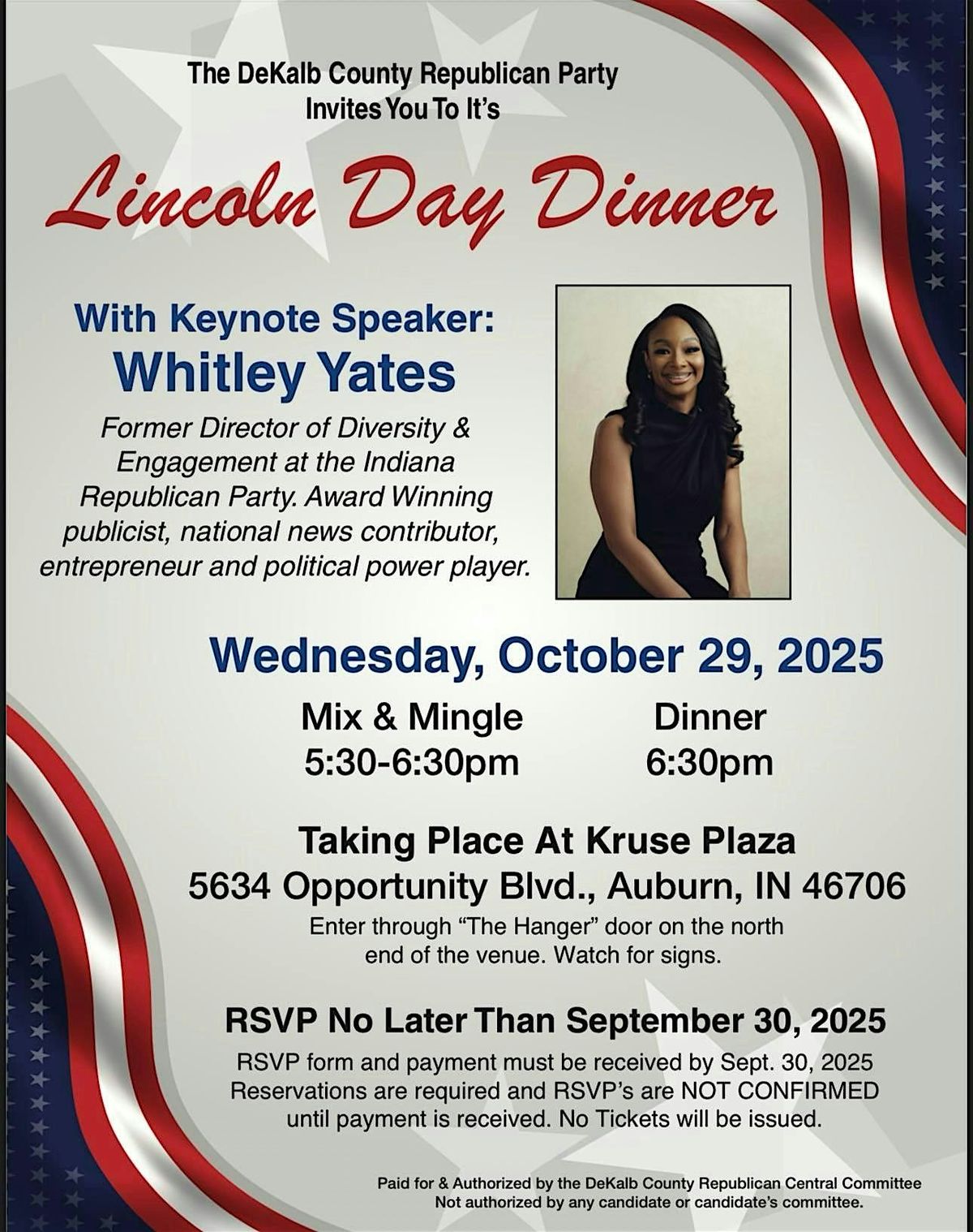 Please join us at the Kruse Plaza in "The Hanger" on Wednesday, October 29th for social hour, silent auction, dinner, and Keynote Address by Whitley Yates. Open seating $75 per person or table sponsors available. RSVP by September 30th. You can call Vice Chairman Holly Albright at [email protected]