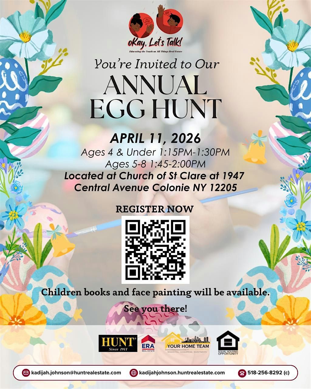 We’re excited to see you! Join us for a fun-filled afternoon on Saturday, April 11, 2026 from 1:00–2:00 PM at the Church of St. Clare (1947 Central Avenue, Albany, NY 12205). This event is completely FREE for families to enjoy! Children will receive free books, toys, and can enjoy free face painting in addition to the egg hunt.