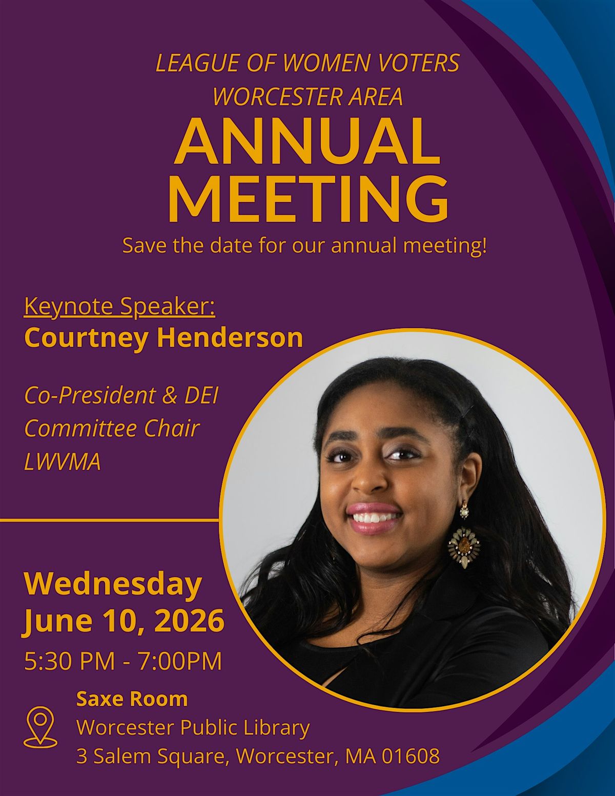 Our annual meeting is here! Join us on Wednesday, June 10th at the Worcester Public Library, where we will be joined by Courtney Henderson, the Co-President & DEI Committee Chair of the League of Women Voters of Massachusetts.