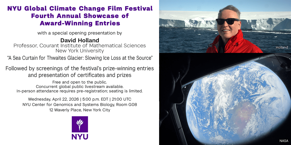 The evening begins with a special presentation by , Professor at the Courant Institute of Mathematical Sciences at New York University, whose research examines the changing dynamics of the Greenland and Antarctic ice sheets and their implications for future sea-level rise. In his talk, “A Sea Curtain for Thwaites Glacier: Slowing Ice Loss at the Source,” Holland will address one of the most pressing questions in contemporary climate science.