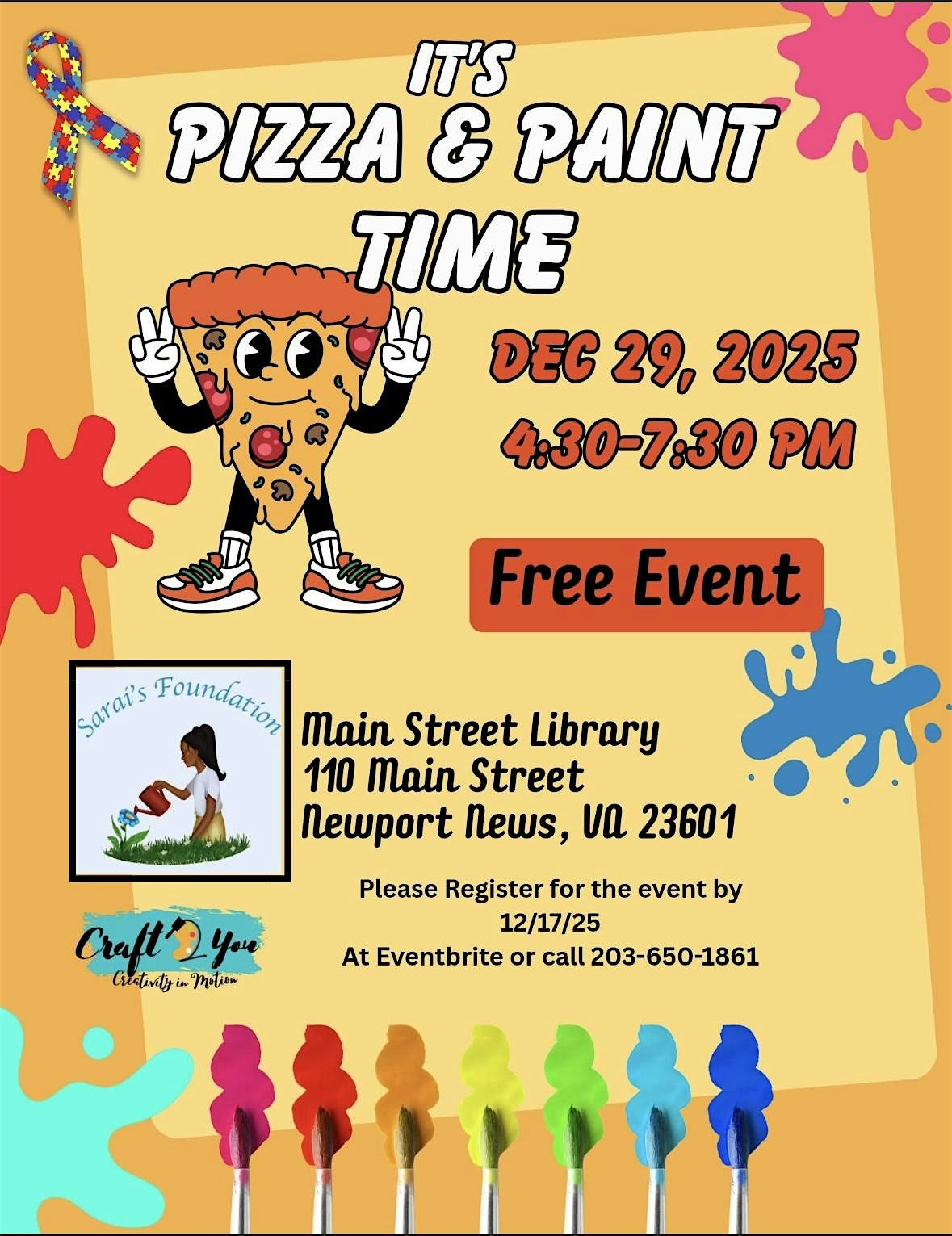 Welcome to the Annual Pizza & Paint event! Join us at 110 Main St on December 29, 2025 at 4:30 PM (Eastern Time) for a fun-filled evening of creativity and delicious pizza. No experience is needed - just bring your enthusiasm and we'll provide all the materials you need to create your masterpiece. Let's paint, eat pizza, and make memories together. See you there!