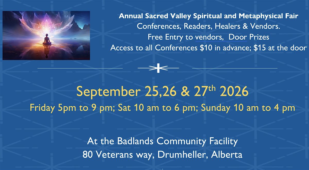 Come join us at the Badlands Community Facility for a day filled with spiritual exploration and metaphysical wonders on September 25, 2026 at 5:00 PM, September 26, 2026 at 10:00 AM and September 27, 2026 at 10:00 AM (Mountain Time).