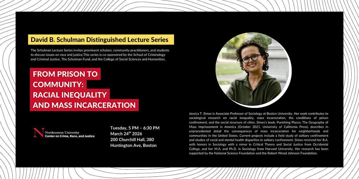 Dr. Jessica T. Simes will be visiting Northeastern to deliver a guest lecture titled From Pr*son to Community: Racial Inequality and Mass Incarceration. Her research examines how systems of punishment shape communities and how patterns of incarceration reflect broader racial and social inequalities across the United States.