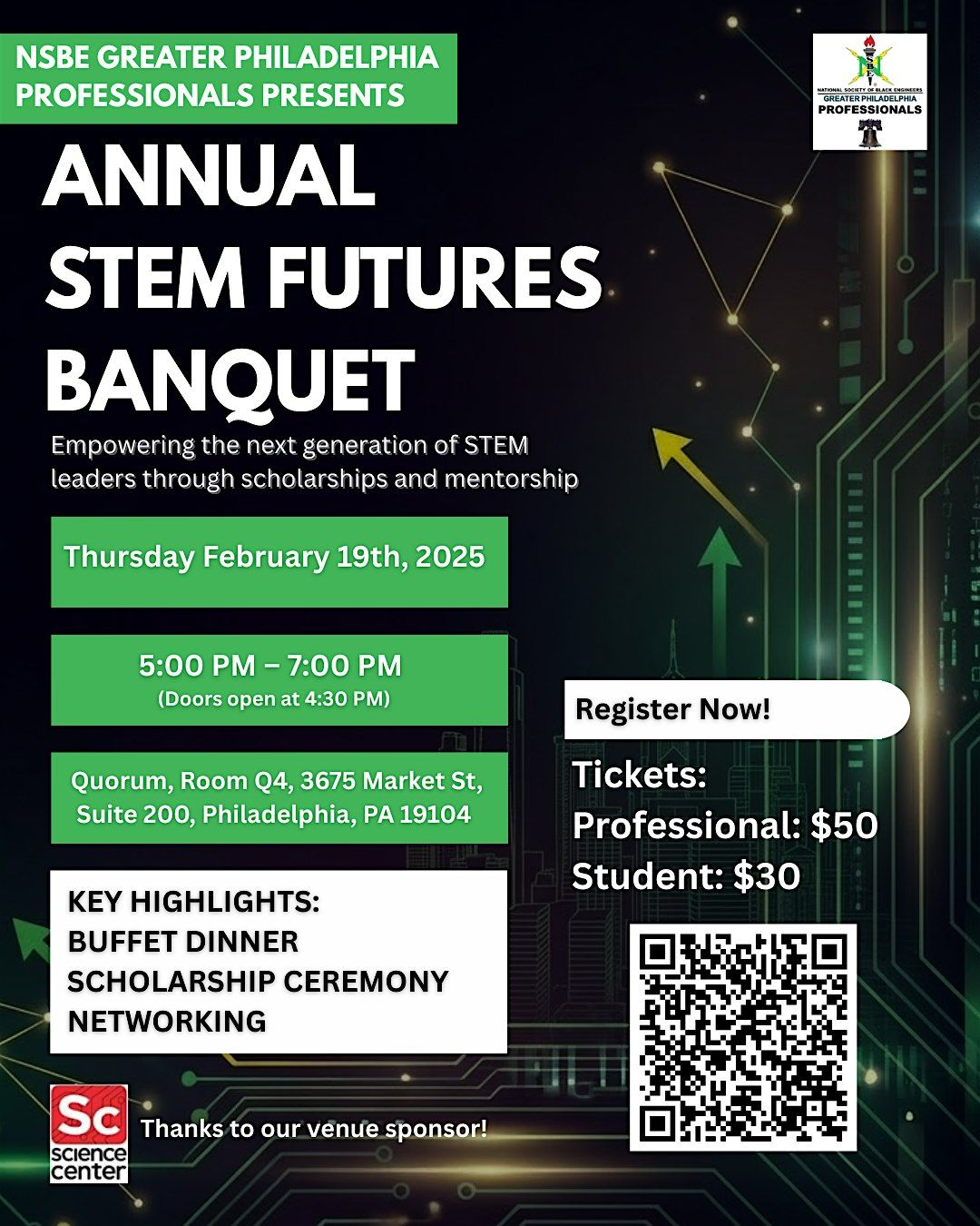 The NSBE Greater Philadelphia Professionals invite you to an evening dedicated to recognizing and supporting the next generation of STEM leaders. The STEM Futures Scholarship Banquet will celebrate outstanding high school seniors who have demonstrated excellence in STEM and award three $1,000 scholarships to help further their education.