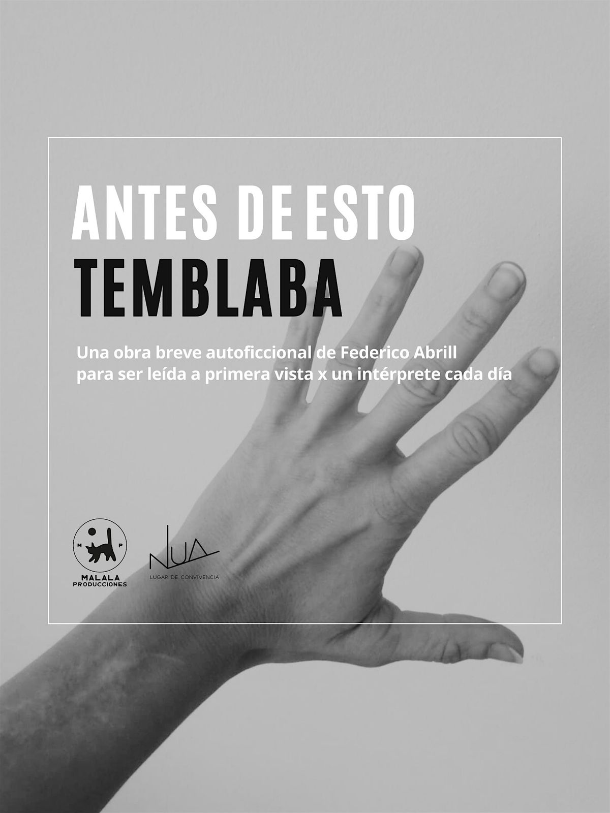 Antes de esto, temblaba es una obra breve de autoficción de Federico Abrill para la compañía Malala Producciones. Te esperamos el domingo 17 de marzo de 2024 a las 13:00 en Esquina Nua (C. de Aguilón, 7) con la actriz invitada Inma Garzía.