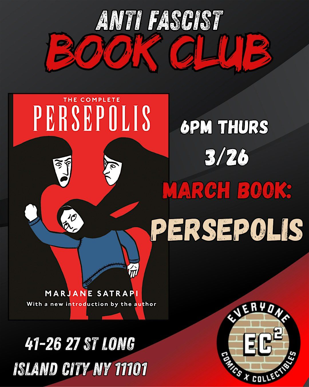 Every month we host an anti fascist book club and this smonth we wil be reading Marjane Satrapi's Persepolis