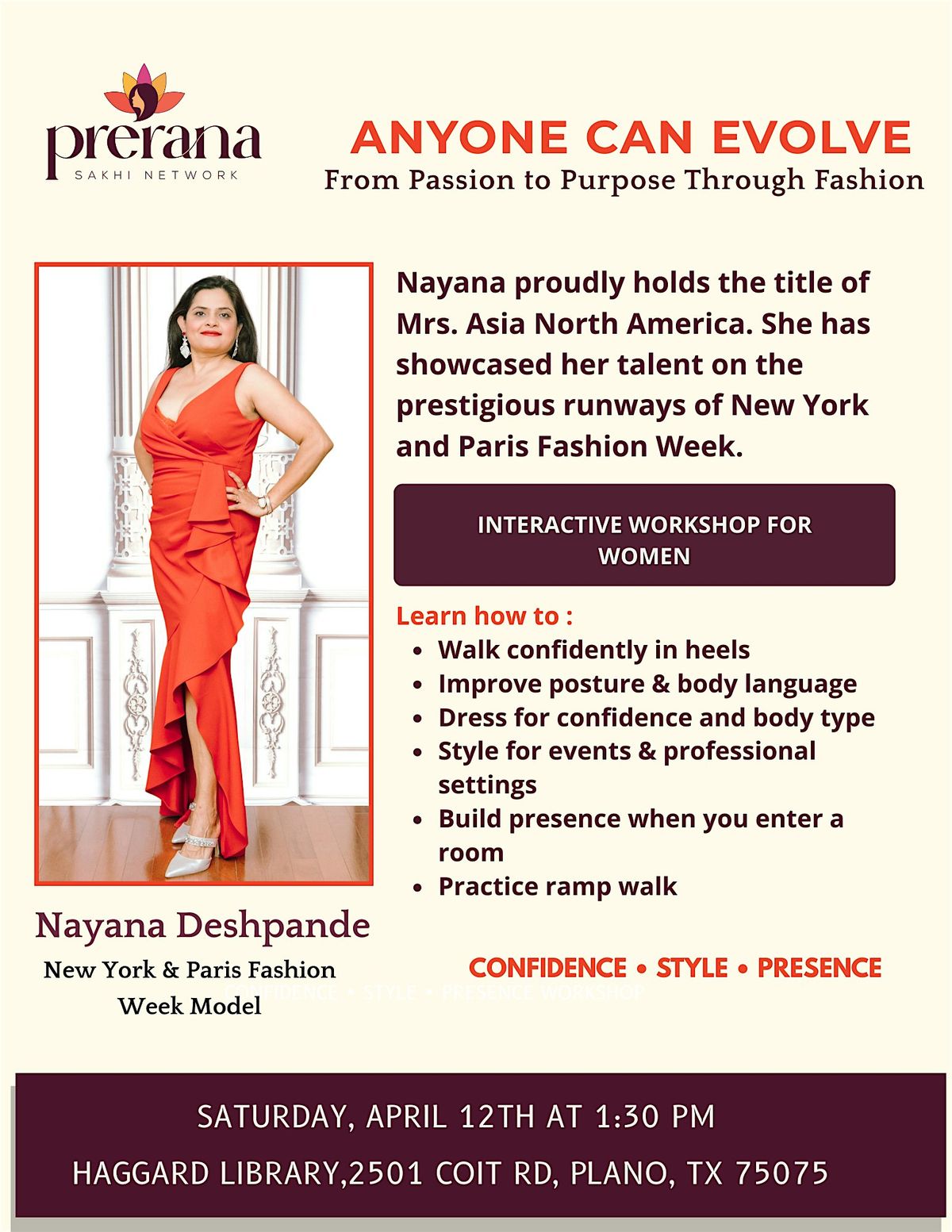 This session is led by our featured speaker, NAYANA DEDHPANDE, who proudly holds the title of Mrs. Asia North America and has showcased her talent on the prestigious runways of New York and Paris Fashion Week.