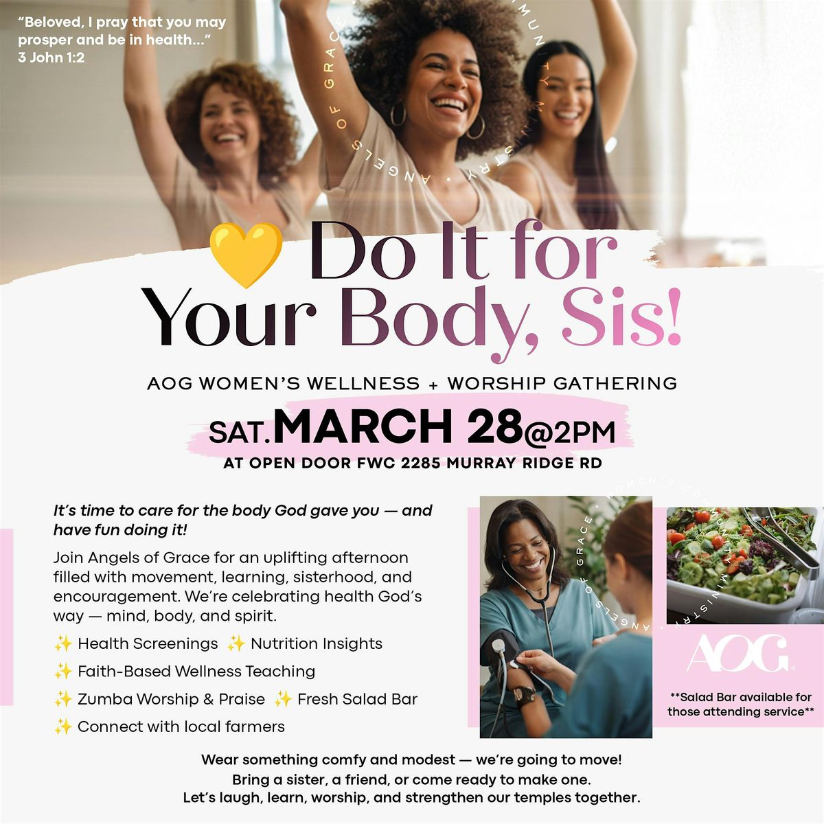 Get ready, ladies! Join Angels of Grace for an afternoon of faith, fitness, and fellowship. Enjoy health screenings, connecting with local farmers, powerful wellness teachings, and a guided Zumba and worship dance! Come worship, learn, move and be renewed—body, mind, and spirit!