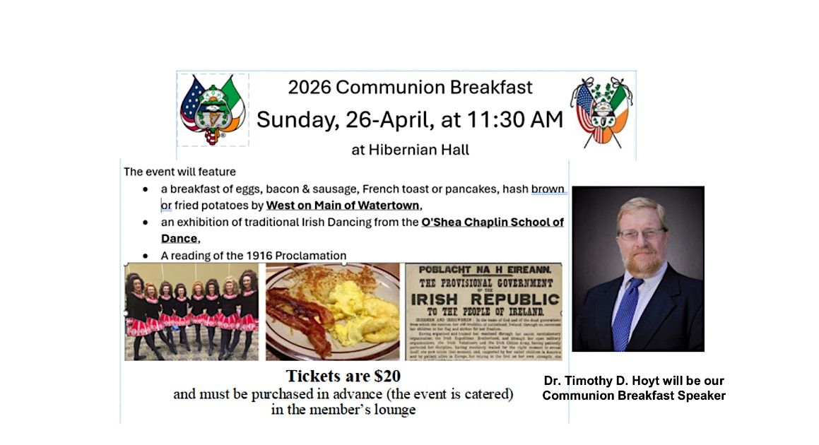 The Ancient Order of Hibernians is hosting its annual Communion Breakfast on April 26th. A hot Breakfast will be catered by West and Main, and the event will include Irish Step Dancing from the local O'Shea/Chaplin School of Dance. We will close with a reading of the 1916 Proclamation.