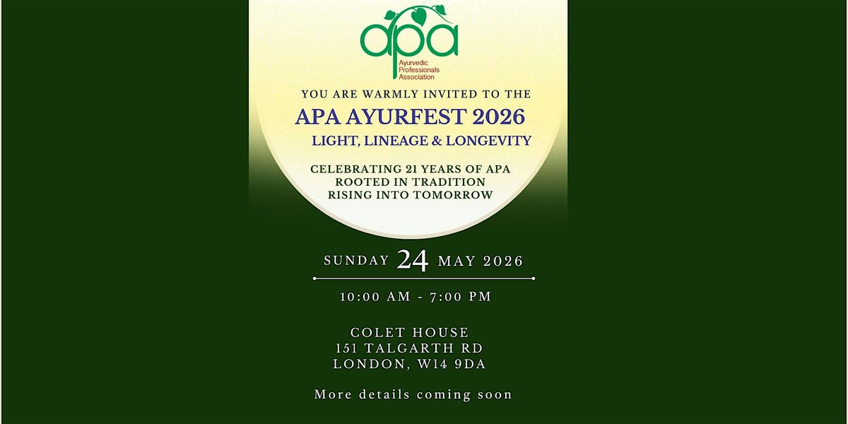 APA is delighted to warmly invite you to take part in a major milestone for the UK Ayurvedic community. This year, the Ayurvedic Professionals Association (APA) celebrates its 21st Anniversary. To mark the occasion, we are hosting our flagship in-person event: APA AyurFest 2026: Light, Lineage & Longevity.