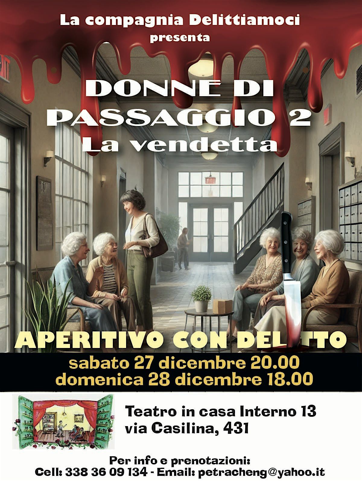Sabato 27 dicembre alle 20.00 e Domenica 28 dicembre alle 18 nel Teatro in casa – Interno 13 (via Casilina 431 – zona Casilina – Torpignattara) ci sarà uno l’aperitivo con delitto di e con Piera Fumarola e Aldo Gordiani “Donne di passaggio 2”.