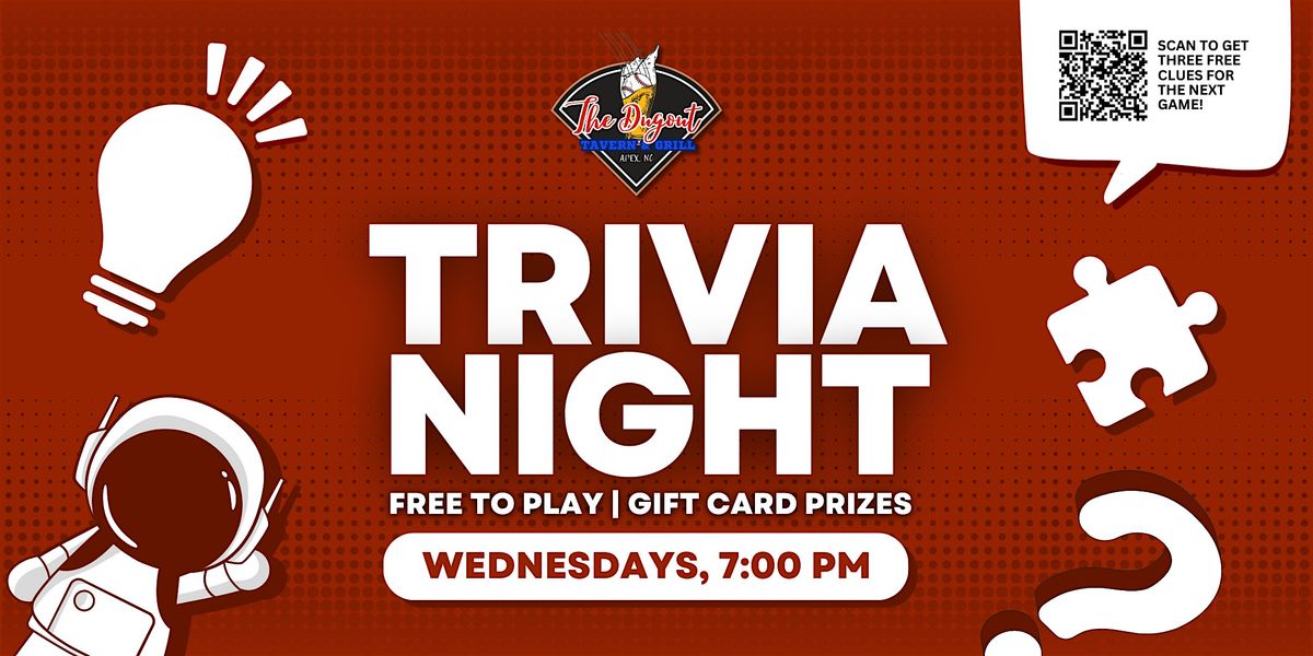 Join us for free live trivia every Wednesday at 7pm at The Dugout Tavern & Grill, located at 1413 Kelly Rd, Apex, NC! Free to play, and top teams win fun prizes!
