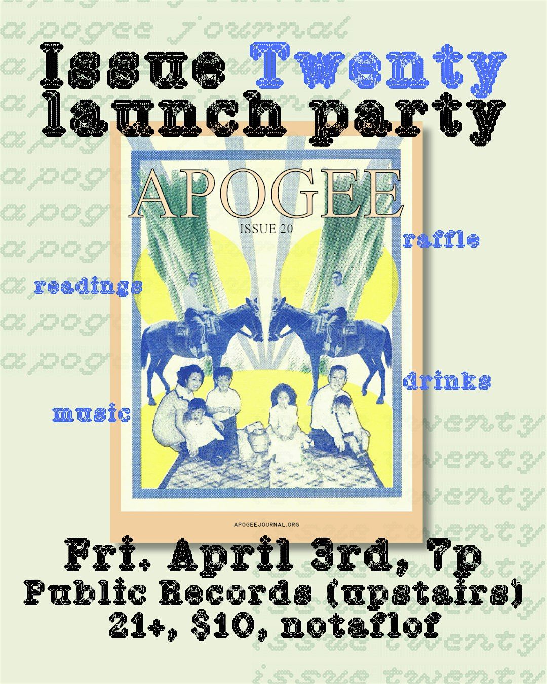 Doors open at 6:30, followed by a reading with Issue 20 contributors from 7-8 pm, and drinks, music, and more. We'll also have merch available and a very special raffle featuring manuscript consultations and signed books by Apogee staff, friends, and fam.