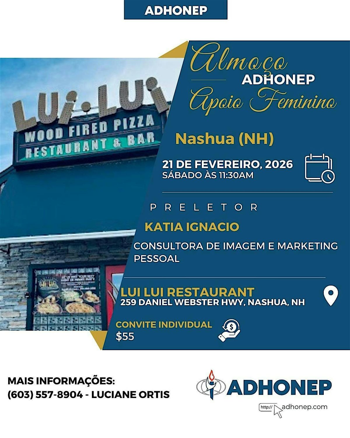 Um momento exclusivo para mulheres que desejam crescer, se conectar e se inspirar. Almoço no restaurante LuiLui em Nashua, networking feminino e uma convidada especial compartilhando sua trajetória profissional e insights sobre marketing pessoal, em um ambiente acolhedor, inspirador e de conexão.