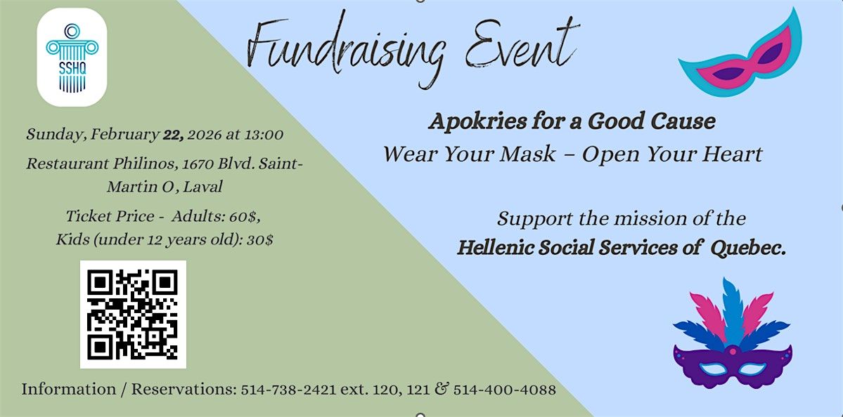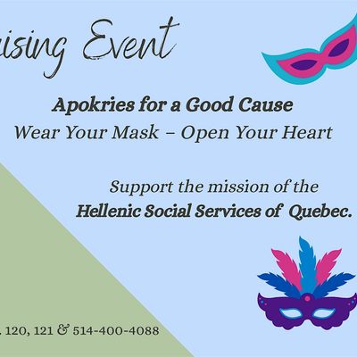 Join us in person for a fun-filled day where wearing your mask is all about spreading love and kindness. Eat, laugh, and connect with great people while supporting the work of the Hellenic Social Services of Quebec, and the programs that assist individuals and families in our community. It’s a chance to open your heart, share the spirit of solidarity and make a difference!