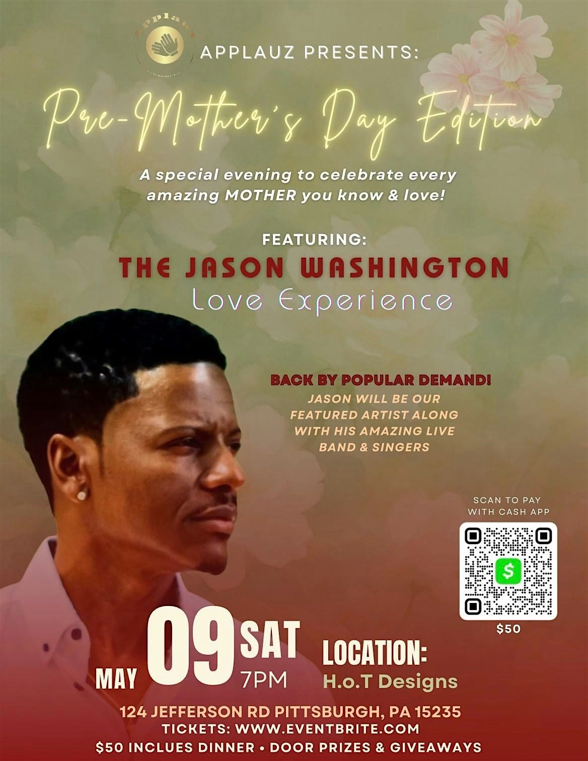 Get ready for an epic in-person experience at Applauz, Pre-Mother's Day Show and Dinner, Featuring Mr. Jason Washington and the Love Experience, at H.o.T. Designs Studio in Penn Hills, 124 Jefferson Rd. Applauz is where energy meets excitement, and great vibes are guaranteed. It's an evening to celebrate Mom's as they should be, Dine and enjoy great live music. Be part of something unforgettable. Whether you come to enjoy a nice evening out with family and friends over dinner and great live music or just want to soak up the atmosphere of elegance, love and light. Applauz is the place to be! This is a BYOB affair. See you there!