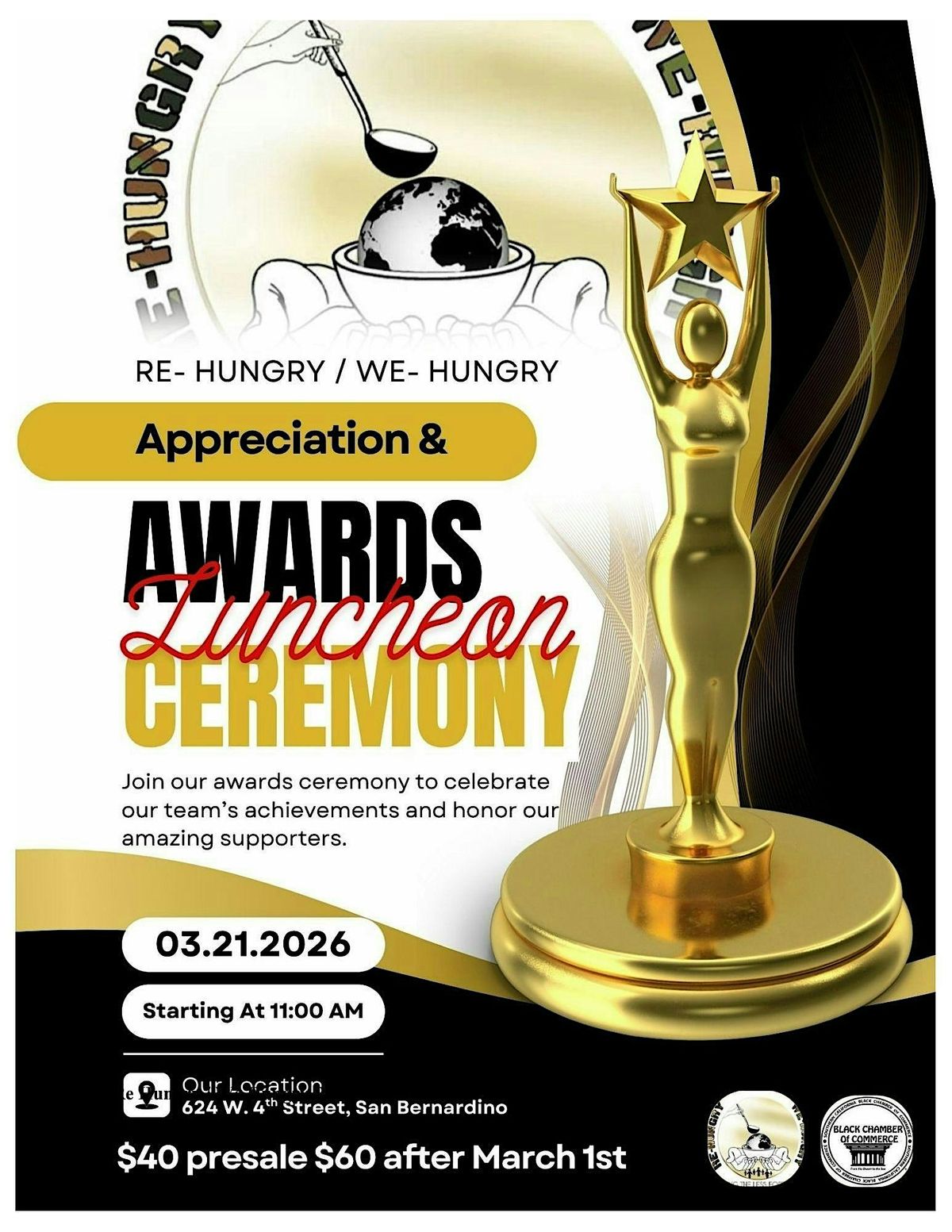 We are delighted to invite you to our "Re Hungry / We Hungry " Luncheon Awards ceromony, a special event dedicated to celebrating the hard work, dedication, and acheivements of those who support our homeless community.