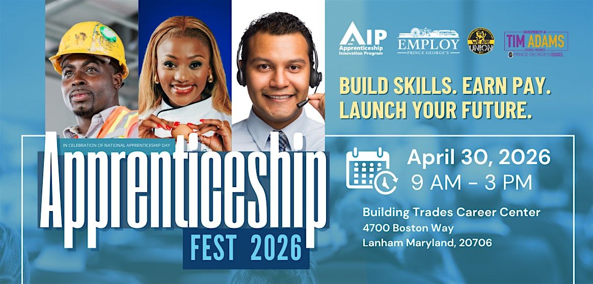 Join us April 30 for the Apprenticeship Fest 2026 event held at the Building Trades Career Center located at 4700 Boston Way, Lanham MD, 20706.