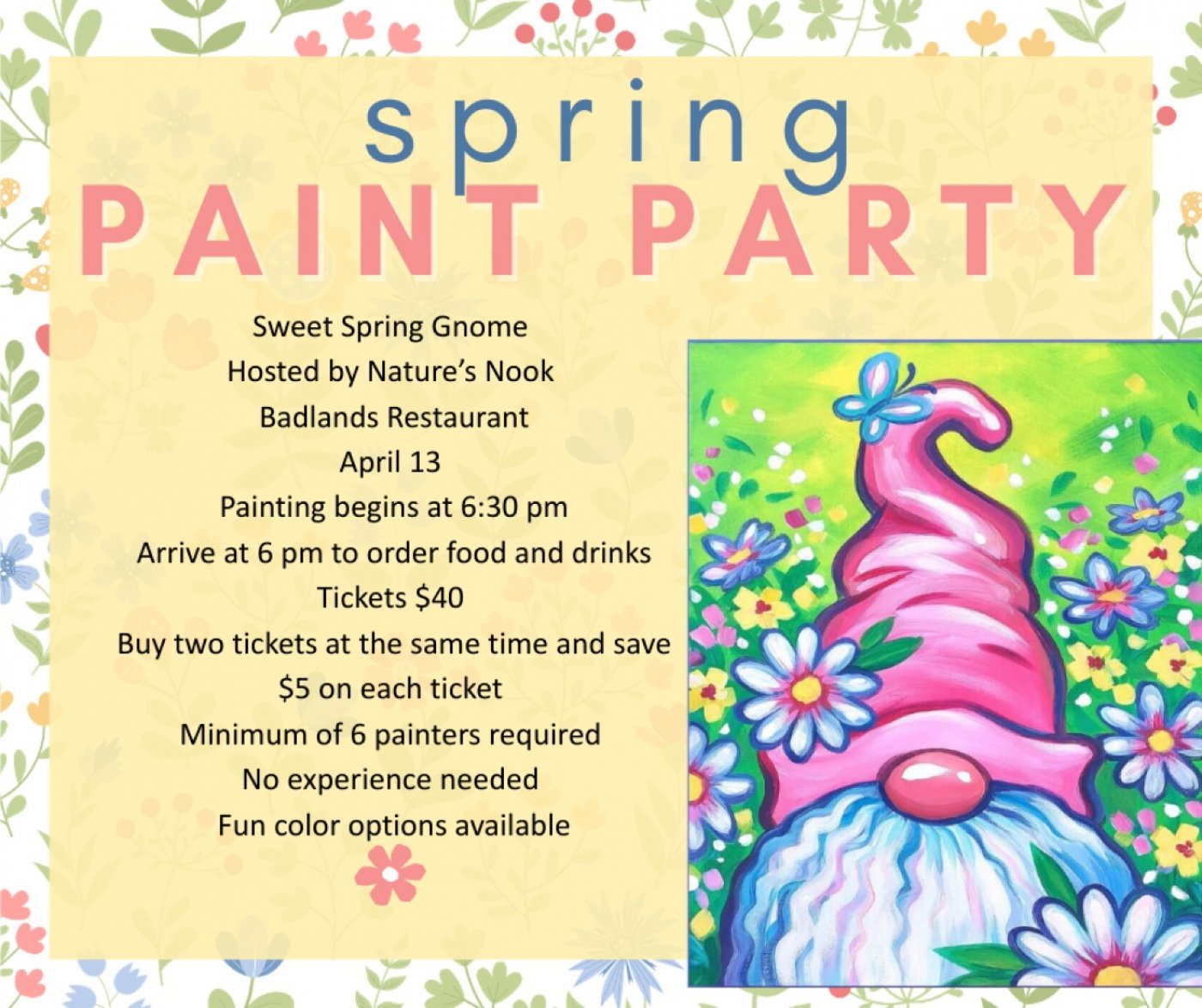 Join us April 13th at Badlands for a cheerful spring paint night hosted by Nature’s Nook.