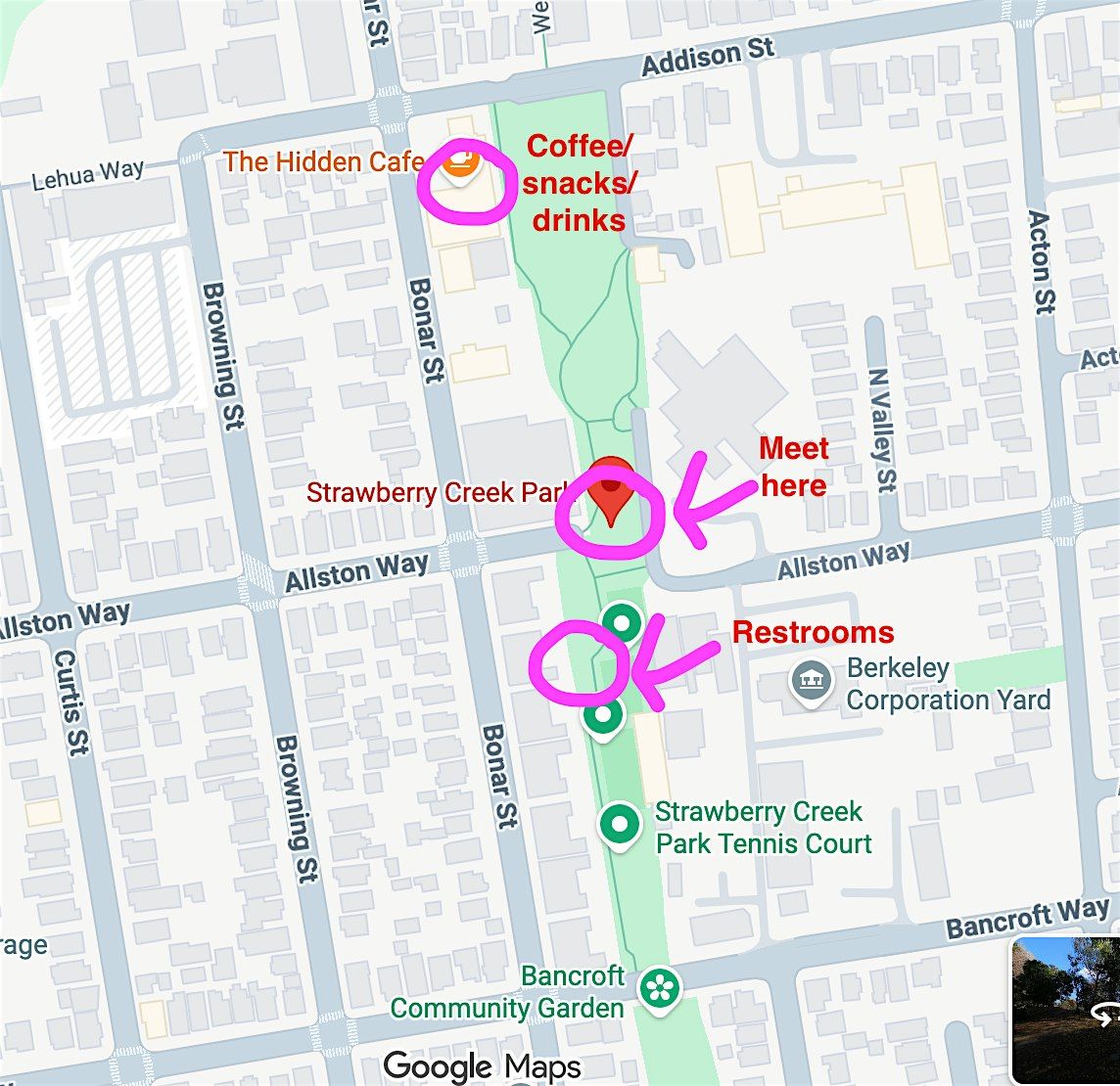 We’ll be meeting at Strawberry Creek Park. Please see the map for the exact location we will be meeting at (please note: we NOT meeting in front of The Hidden Cafe, we are meeting at the intersection of Allston and the park).