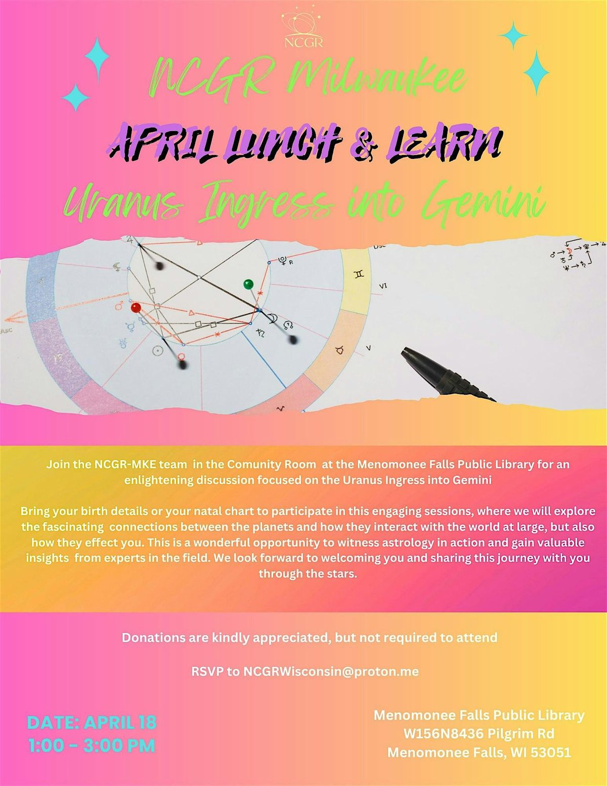 NCGR Milwaukee is an astrology group chapter that provides astrological education. We are a local chapter to Wisconsin, that is a part of larger national organization. In the month of April, we will be discussing the Uranus Ingress into Gemini. This event is free of charge. There will be light snacks provided. But this is open to pot-luck and you are welcome to bring something to share.